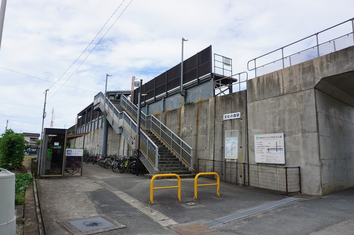中田14;57発普通徳島行き4556D(1558)で文化の森へ。平成2年11月3日に開業した駅で、園瀬川橋梁架け替え工事に伴って平成13年11月21日に高架化されています。徳島県文化の森総合公園への最寄り駅として開業したものの、約1.4㎞離れており、30分以上かけて歩くか、バスに乗り換えていかねばなりません。