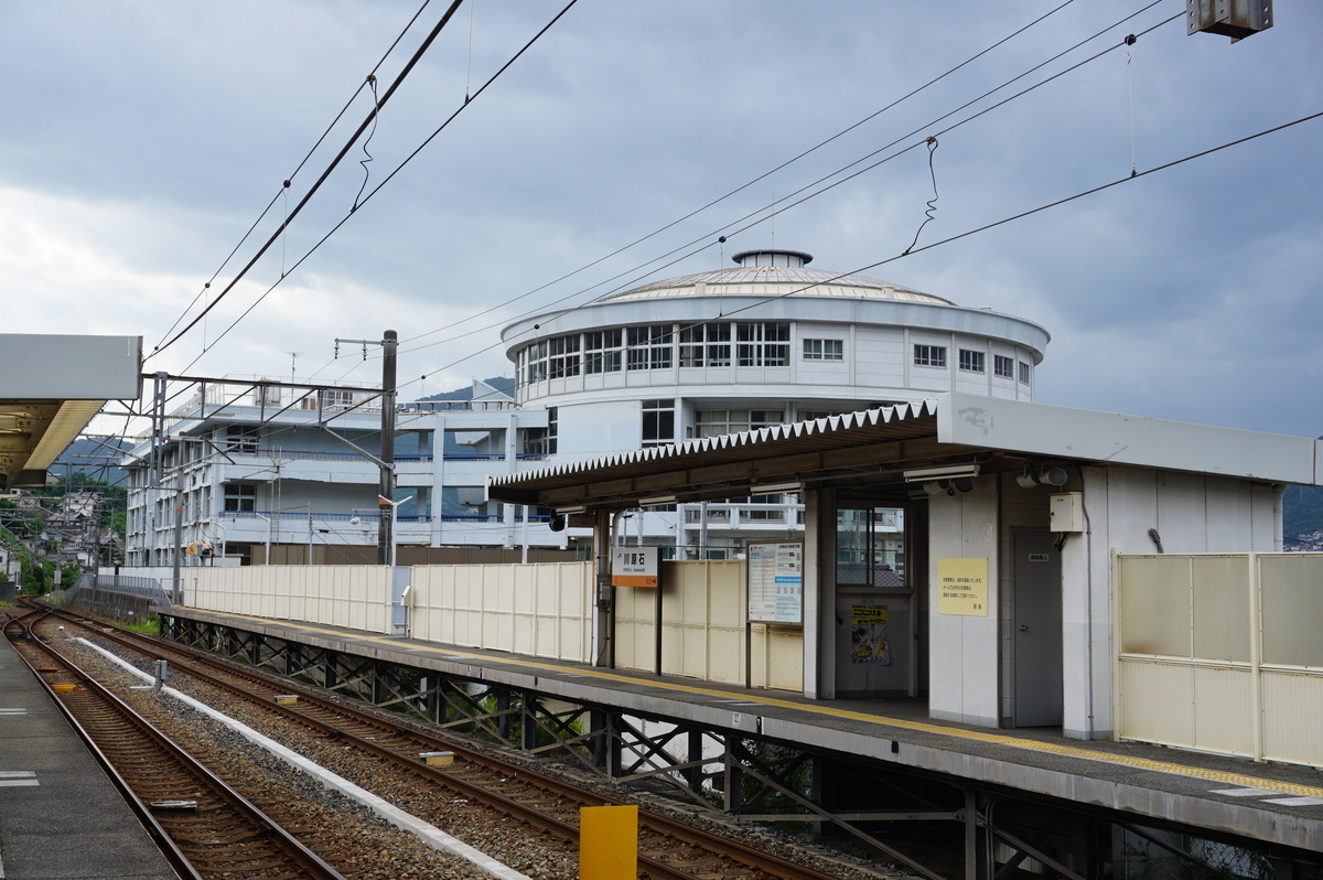 坂7:16発普通広行き608M(クモハ227-102)で川原石へ。呉市街を見下ろす築堤上の駅で、平成11年2月7日に現在地に移転しました。ホームからは中国地方唯一の現役円形校舎・呉市立港町小学校が見えます。昭和37年に建てられたもので、耐震性不足から解体が決定しています。