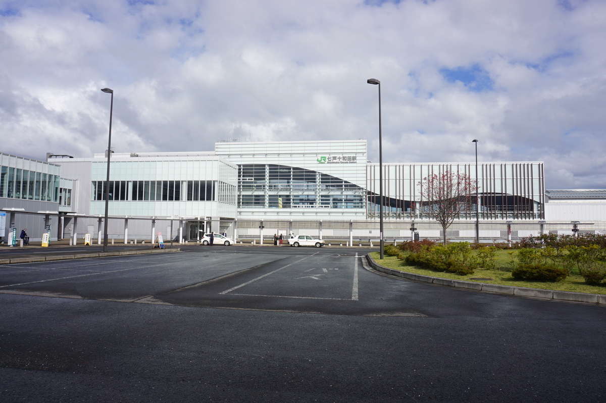 二戸10:13発はやぶさ5号新青森行き3005E(E526-415)で七戸十和田へ。平成22年12月4日、新青森までの延伸に際して開業した駅で上北郡七戸町唯一の駅です。開業前の仮称は「七戸」でしたが、十和田湖への玄関口としてこの駅名になりました。七戸町にはかつて南部縦貫鉄道というローカル私鉄が通っており、交差地点に駅を設けて接続する計画もありましたが、南部縦貫鉄道は新幹線の開業まで持ちこたえることができず、平成9年に休止、平成14年に廃止されています。橋上駅舎は大きさの異なる3つの箱を組み合わせたデザインで、中央の箱が八甲田連峰を、新青森側の箱(左)が町の未来、八戸側の箱(左)が奥州街道の松並木を表しており、曲線は八甲田の山並みと南部馬の背をモチーフとしているそうです。
