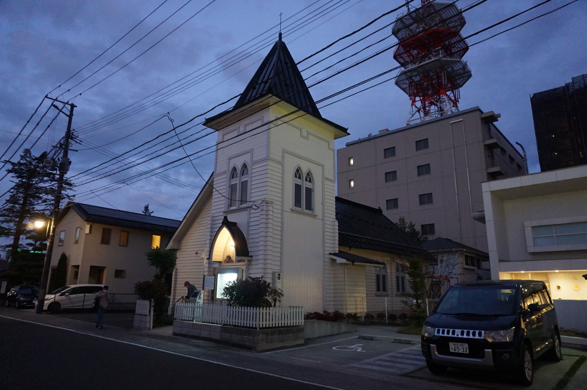 もう日も暮れかけていますが、西口から一関市街へ。日本基督教団一関教会は昭和4年に当時の宮古教会牧師・羽生義三郎の設計で建てられたもので、平成19年に国の登録有形文化財となっています。